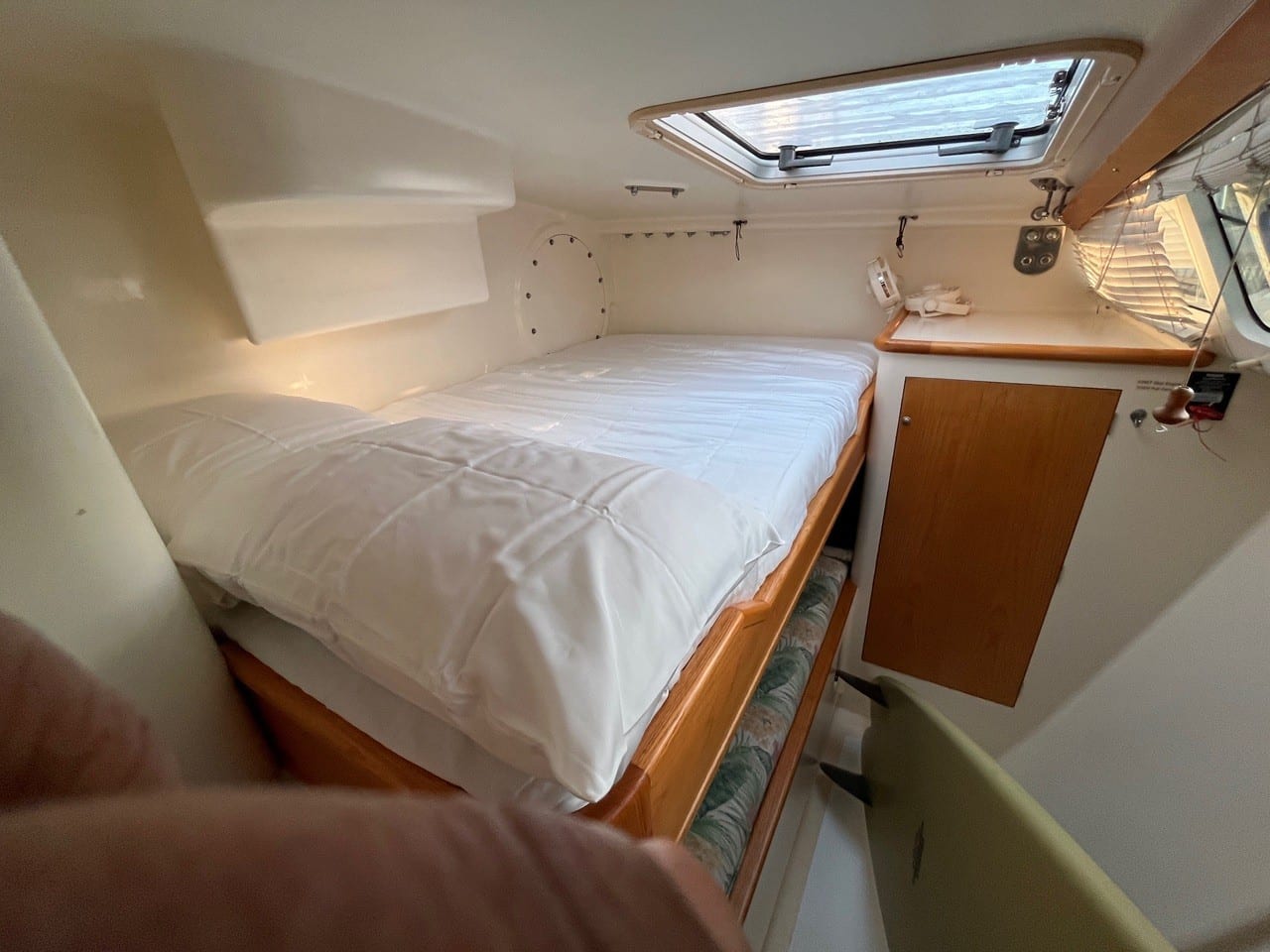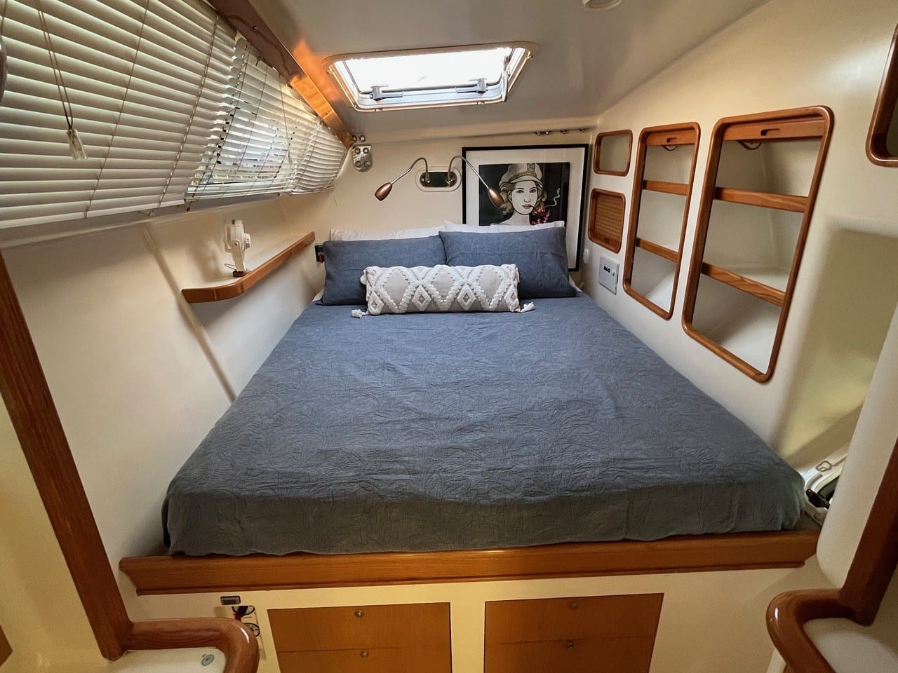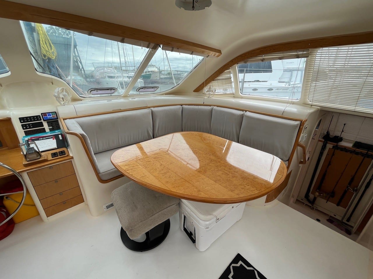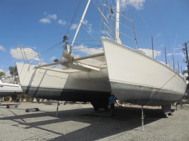 An inspection of this well designed and constructed with optimised for efficient sailing, with 2 steering